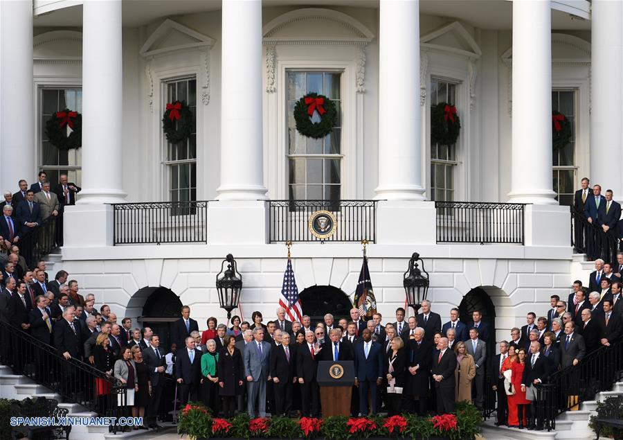 El presidente estadounidense, Donald Trump (frente), pronuncia un discurso durante un evento en celebración de la aprobación de una iniciativa para modificar el código fiscal, en el Patio Sur de la Casa Blanca, en Washington D.C., Estados Unidos, el 20 de diciembre de 2017. (Xinhua/Yin Bogu)