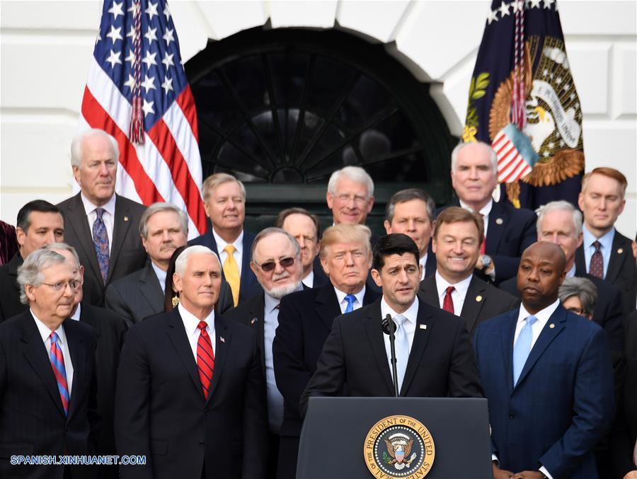 El presidente de la Cámara de Representantes de Estados Unidos, Paul Ryan (frente), pronuncia un discurso durante un evento en celebración de la aprobación de una iniciativa para modificar el código fiscal, en el Patio Sur de la Casa Blanca, en Washington D.C., Estados Unidos, el 20 de diciembre de 2017. (Xinhua/Yin Bogu)