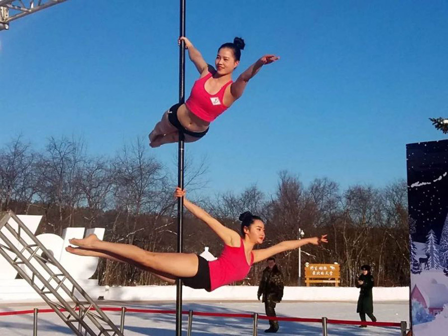 Las bailarinas de baile en barra durante la ceremonia de aperturade la Competición de Baile en Barra sobre Nieve 2017 en Mohe, provincia de Heilongjiang, al noreste de China, el 21 de diciembre de 2017. [Foto proporcionada a chinadaily.com.cn]
