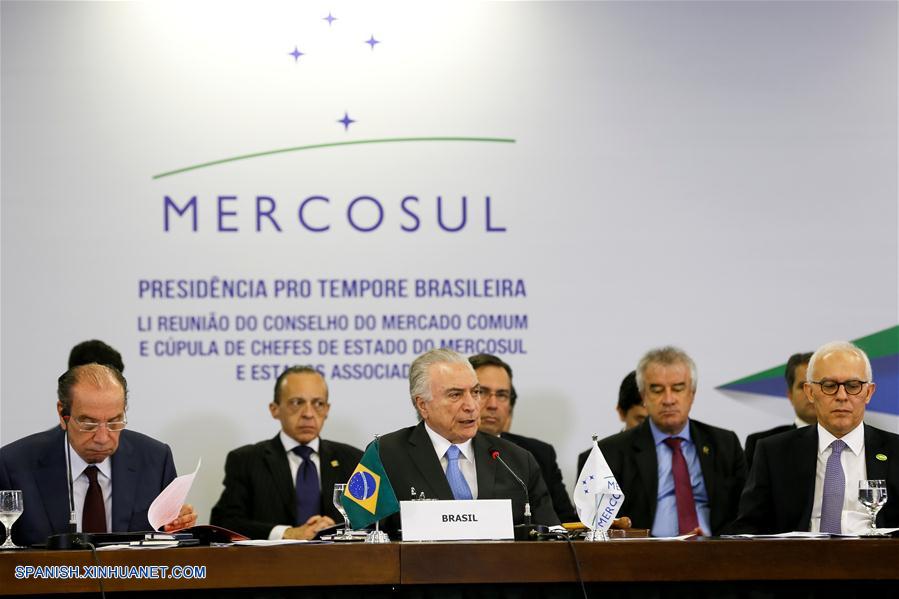Imagen cedida por la Presidencia de Brasil, del presidente brasile?o Michel Temer (c-frente), participando durante la 51 Cumbre del Mercado Común del Sur (Mercosur) y Estados Asociados, en Brasilia, Brasil, el 21 de diciembre de 2017. El presidente de Brasil, Michel Temer, realizó el jueves un balance positivo de la 51 Cumbre del Mercado Común del Sur (Mercosur) y Estados Asociados, y destacó la vocación común de los países fundadores de alcanzar nuevos acuerdos con otros bloques y naciones. (Xinhua/Beto Barata/Presidencia de Brasil)
