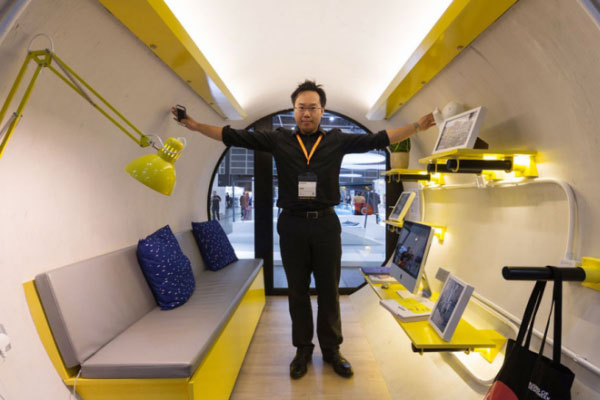 Jonathan Kong, director de dise?o de James Ley Cybertecture, extiende sus brazos para mostrar el ancho del tubo Opod House en la Exposición de Dise?o de Hong Kong, China, el 8 de diciembre del 2017. [Foto: IC]