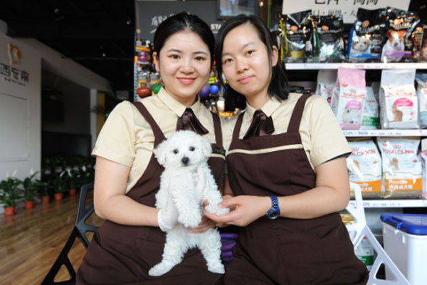 Jiao Xuena (a la izquierda) y Zhang Ling posan con un perro mascota en el BC Hotel Pet en Qingdao, provincia de Shandong, 15 de junio del 2017. [Foto: VCG]