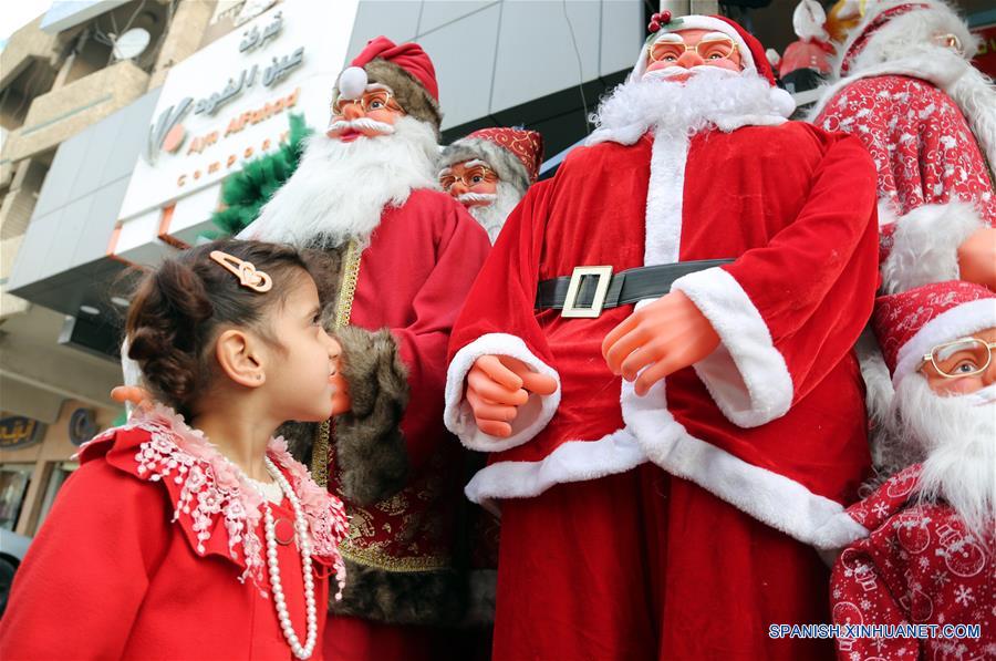 BAGDAD, diciembre 23, 2017 (Xinhua) -- Una ni?a camina frente a una tienda que vende productos de Navidad, en Bagdad, Irak, el 23 de diciembre de 2017. Los hombres de negocios iraquíes están decorando sus tiendas con Santa Claus inflables y árboles de Navidad de plástico previo a la Navidad. (Xinhua/Khalil Dawood)