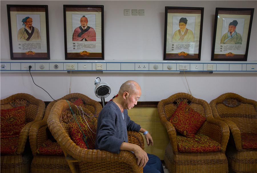 Un paciente recibe terapia de acupuntura eléctrica en el Hospital contra el Cáncer de Chongqing. De la pared cuelgan imágenes e instrucciones de afamados médicos como Hua Tuo, Li Shizhen Zhang Zhongjing y Sun Simiao. [Foto: Liu Song]