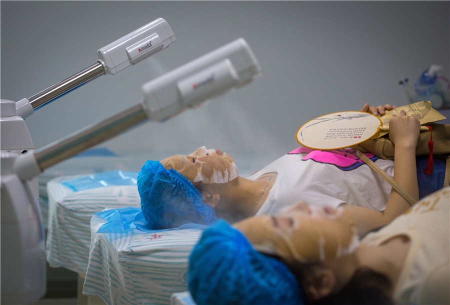 Máscaras faciales hechas de hierbas medicinales se aplican en el Hospital de Medicina Tradicional China de Chongqing. [Foto: Liu Song]