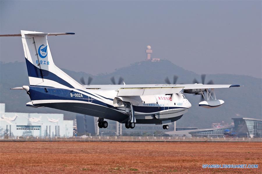 El primer avión anfibio grande de fabricación doméstica de China, AG600, aterriza en el Aeropuerto de Aviación Civil de Jinwan, en Zhuhai, en la provincia de Guangdong, en el sur de China, el 24 de diciembre de 2017. El AG600, de nombre código "Kunlong", completó su vuelo inaugural el domingo. Dise?ado para ser el avión anfibio más grande del mundo, el AG600 se utilizará principalmente para el rescate marítimo, la lucha contra los incendios forestales, y la vigilancia marina. El AG600 es el tercer miembro de la "gran familia de aviones" de China después del gran carguero Y-20 y el gran avión de pasajeros C919, que realizaron sus vuelos inaugurales en 2013 y 2017. (Xinhua/Liang Xu)