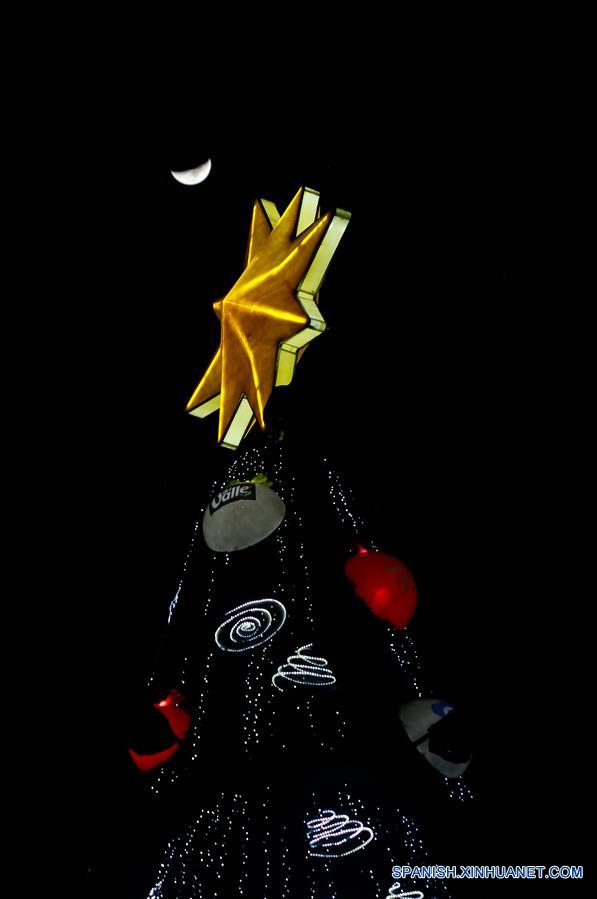 La luna brilla sobre el Arbol de Navidad instalado en el Zócalo de la Ciudad de México, capital de México, el 24 de diciembre de 2017. (Xinhua/Francisco Ca?edo)