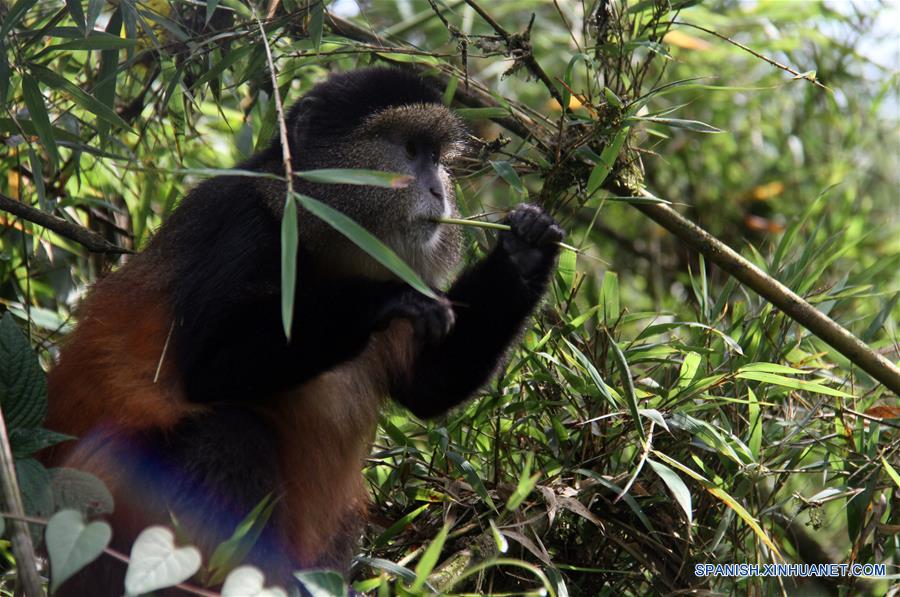 Un mono dorado come bambú en el Parque Nacional de los Volcanes, en el occidente de Ruanda, el 25 de diciembre de 2017. De acuerdo con información de la prensa local, el mono dorado está catalogado como una especie en peligro de extinción por la Unión Internacional para la Conservación de la Naturaleza (UICN). Según la UICN, el mono dorado tiene un rango de distribución muy peque?o y se encuentra sólo en los volcanes de Virunga, compartidos por Ruanda, Uganda, y la República Democrática del Congo. (Xinhua/Lyu Tianran)