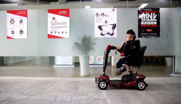 Yang se desplaza en un transporte eléctrico por el edificio de la empresa. [Foto: proporcionada]