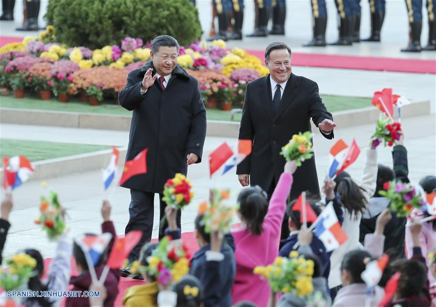 Imagen del 17 de noviembre de 2017 del presidente de China, Xi Jinping (i), ofreciendo una ceremonia de bienvenida al presidente de Panamá, Juan Carlos Varela, previo a sus conversaciones, en Beijing, capital de China. China y Panamá establecieron el 13 de junio relaciones diplomáticas formales, un hecho histórico que abre una nueva y prometedora era en las interacciones bilaterales y concuerda con los intereses fundamentales y a largo plazo de ambos países. Cinco meses después, el presidente paname?o, Juan Carlos Varela, realizó una vista de Estado a Beijing del 16 al 22 de noviembre, con lo que mostró su firme voluntad de profundizar la cooperación con el país asiático. (Xinhua/Xie Huanchi)