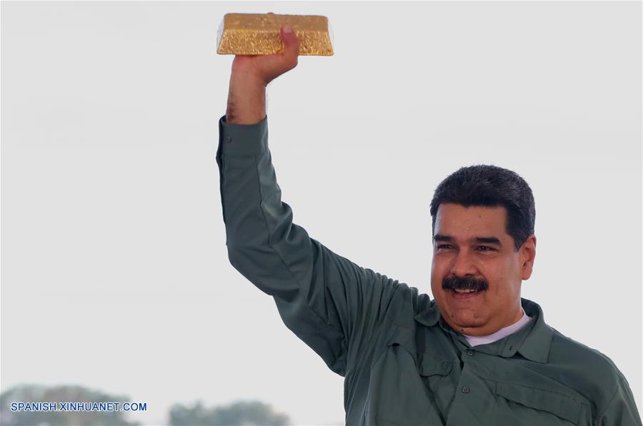 Imagen del 5 de diciembre de 2017 cedida por la Presidencia de Venezuela, del presidente venezolano, Nicolás Maduro, sosteniendo un lingote durante un evento con mineros venezolanos, en el estado Bolívar, Venezuela, el 5 de diciembre de 2017. El 2017 ha sido uno de los a?os más complejos para el gobierno del presidente venezolano, Nicolás Maduro, quien aprovechó la división de la oposición para ganar varias elecciones importantes y, al mismo tiempo enfrentó una crisis económica debido a las sanciones económicas impuestas por Estados Unidos, Canadá y la Unión Europea. Frente a las protestas opositoras emprendidas en abril que exigían, entre otras cosas, la renuncia de Maduro y la celebración adelantada de comicios presidenciales, el mandatario convocó a una Asamblea Nacional Constituyente (ANC) en mayo para reformar el Estado venezolano y crear una nueva Constitución, la cual entró en funciones el 4 de agosto. (Xinhua/Presidencia de Venezuela)