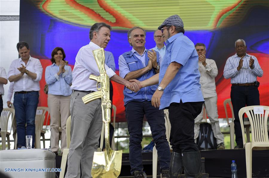 Imagen del 27 de junio de 2017 cedida por la Presidencia de Colombia, del presidente colombiano, Juan Manuel Santos (i-frente), estrechando la mano con el jefe máximo de las Fuerzas Armadas Revolucionarias de Colombia (FARC), Rodrigo Londo?o alias "Timochenko" (d-frente), ante la mirada del Jefe de la Misión de Naciones Unidas en Colombia, Jean Arnault (c-frente), junto a un arma que simboliza la paz, durante la ceremonia de dejación de armas de las FARC, en Buenavista, una vereda del municipio de Mesetas, en el departamento de Meta, Colombia. Tras la firma de un acuerdo de paz entre el gobierno y las FARC el 24 de noviembre de 2016, la guerrilla emprendió un camino difícil durante 2017 para dejar de serlo. Sus más de 7.000 combatientes se agruparon en zonas establecidas para emprender el paso a la vida civil. En contenedores vigilados por la Organización de las Naciones Unidas (ONU) dejaron sus armas y los altos comandantes pidieron perdón a víctimas del conflicto armado de más de medio siglo, además de cambiar el sentido de su sigla FARC por el de Fuerza Alternativa Revolucionaria del Común y elegir a Rodrigo Londo?o como su candidato para la contienda electoral hacia la Presidencia de Colombia. (Xinhua/Efraín Herrera/Presidencia de Colombia)