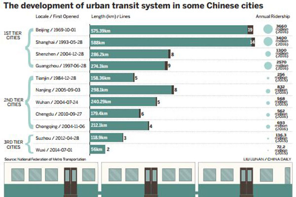 En la primera mitad del 2017, China tenía funcionando en 31 ciudades un sistema ferroviario urbano y 133 líneas que sumaban 4.400 kilómetros, de acuerdo a los datos de la Federación Nacional de Transporte Metropolitano de China.