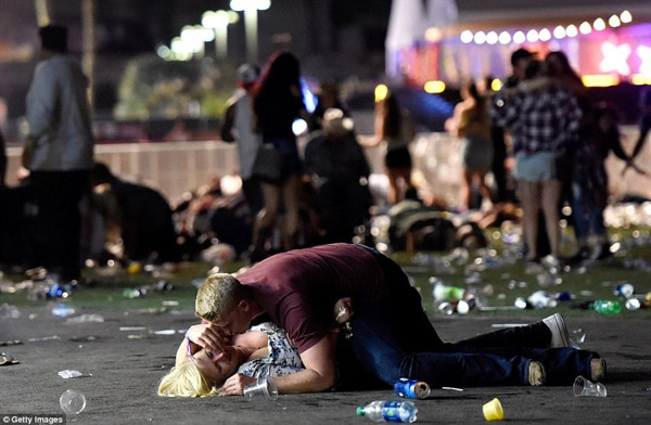 Un hombre protege a una mujer con su cuerpo durante un festival de música country en las Vegas, Nevada, donde un pistolero disparó contra la multitud, 2 de octubre del 2017. [Foto: Xinhuanet]
