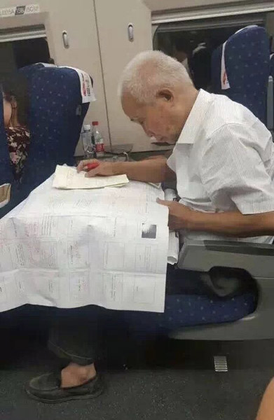 Liu Xianlin, científico bien conocido en la topografía y el mapeo, trabaja mientras se transporta en un tren de alta velocidad, 12 de junio del 2017. [Foto: xinhuanet]