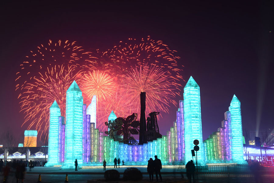 Coloridos fuegos artificiales iluminan el“Mundo del Hielo” de la ciudad de Harbin, provincia de Heilongjiang, 26 de diciembre del 2017. [Foto: IC]