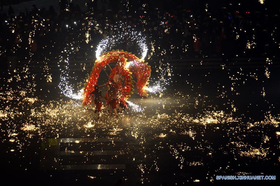 Personas realizan una danza del dragón de fuego en una lluvia de hierro derretido brillando como fuegos artificiales, para recibir al A?o Nuevo en la ciudad antigua de Taierzhuang en Zaozhuang, en la provincia de Shandong, en el este de China, el 30 de diciembre de 2017. (Xinhua/Guo Xulei)