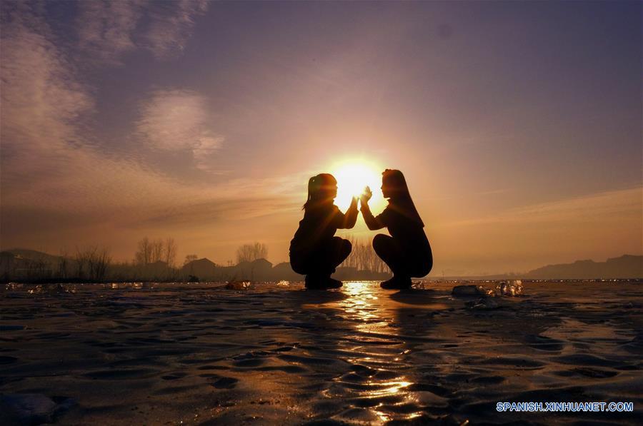 HEBEI, enero 1, 2018 (Xinhua) -- Ni?as posan durante la primera salida del sol del A?o Nuevo, en la zona escénica de Banruohu, en la ciudad de Zunhua, en la provincia de Hebei, en el norte de China, el 1 de enero de 2018. (Xinhua/Liu Mancang)