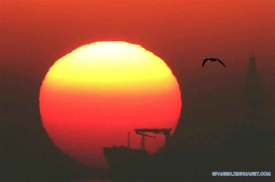 DALIAN, enero 1, 2018 (Xinhua) -- Una gaviota vuela durante la salida del sol en la bahía de Dalian de la ciudad de Dalian, en la provincia de Liaoning, en el noreste de China, el 1 de enero de 2018. (Xinhua/Liu Debin)