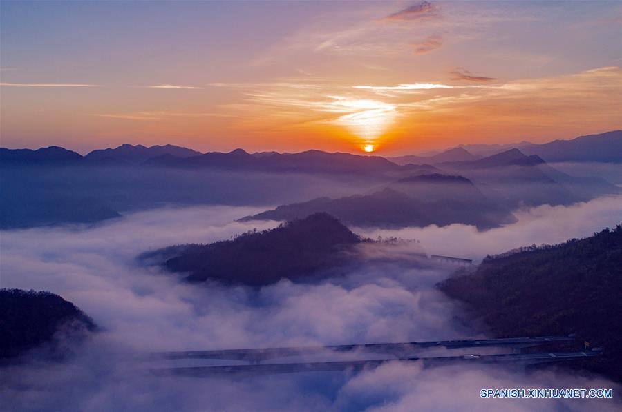 ANHUI, enero 1, 2018 (Xinhua) -- Vista de la salida del sol sobre la monta?a de Dabie, del municipio de Mozitan en el condado de Huoshan, en la provincia de Anhui, en el este de China, el 1 de enero de 2017. (Xinhua/Xu Cheng)