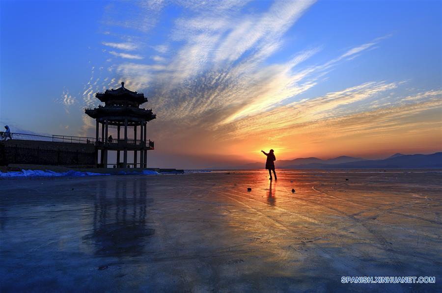 TIANJIN, enero 1, 2018 (Xinhua) -- Turistas observan la salida del sol del A?o Nuevo, en el Lago Cuiping en el distrito de Jizhou de Tianjin, en el norte de China, el 1 de enero de 2018. (Xinhua/Yang Yushan)