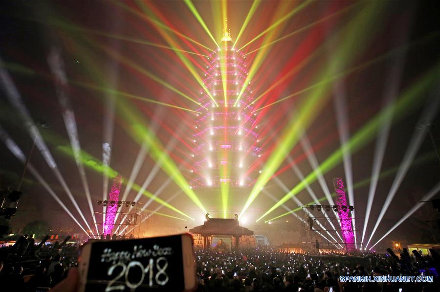 JIANGSU, enero 1, 2018 (Xinhua) -- Personas visitan un espectáculo de luces para celebrar el A?o Nuevo, en Changzhou, en la provincia de Jiangsu, en el este de China, el 1 de enero de 2018. (Xinhua/Chen Wei)