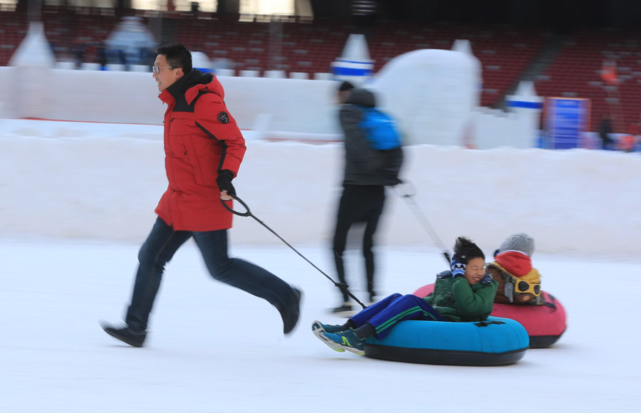 Padres e hijos disfrutan de actividades recreativas sobre hielo en el Estadio Nacional de China, Beijing, 23 de diciembre del 2017. (Foto: Cheng Gong)