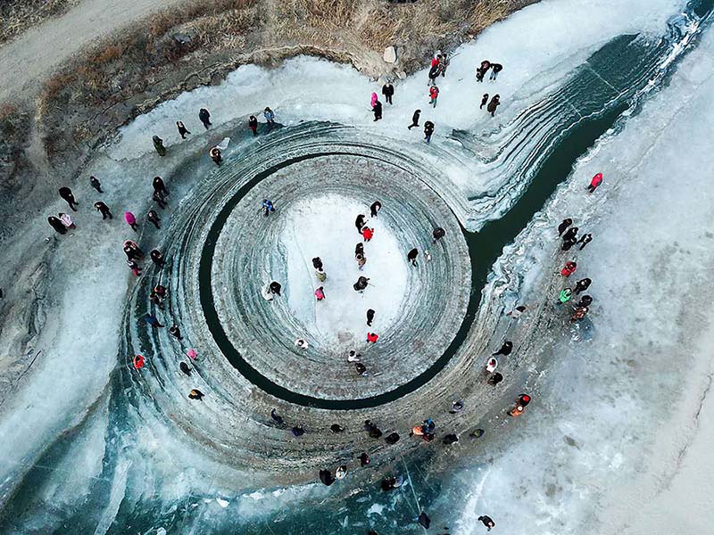 Faku,03/01/2018(El Pueblo en Línea)- La gente se para sobre un círculo de hielo giratorio en el río Liaohe del condado Faku, provincia de Liaoning, mientras que otros miran con fascinación desde fuera, el lunes. El círculo ha atraído a cientos de visitantes, mientras que la causa del fenómeno aún se desconoce. ZHANG CHUNSHENG / CHINA DAILY