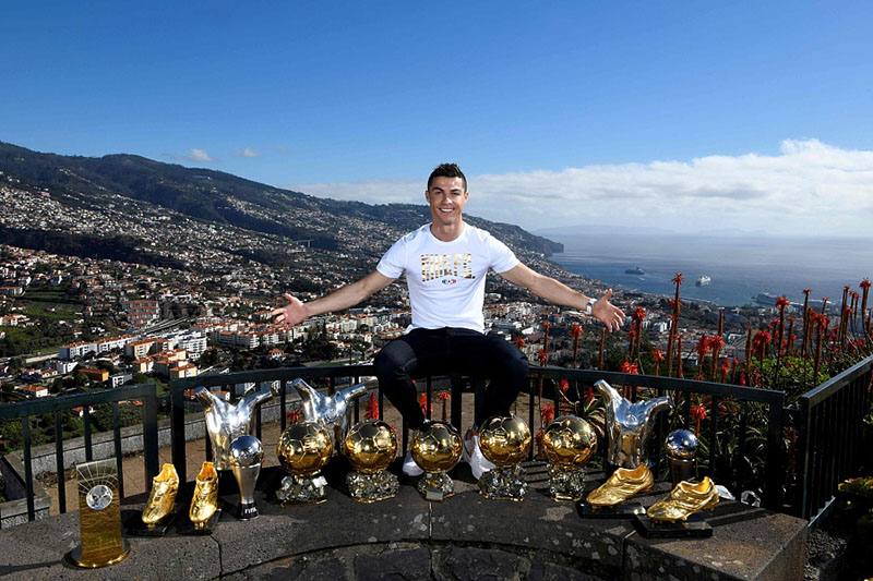 Cristiano Ronaldo posa en Madeira, su tierra natal, junto a 15 trofeos individuales ganados durante su carrera: cinco veces “Balón de Oro”; dos veces “Mejor Jugador” otorgado por la FIFA, una vez “Mejor Jugador del Mundo del A?o” otorgado por la FIFA; tres veces "Jugador del A?o" otorgado por la UEFA y cuatro premios europeos "Botín de oro", 1 de enero del 2018. [Foto: VCG]
