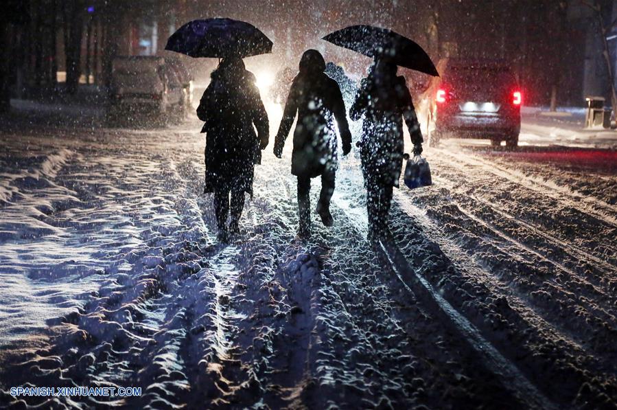 HENAN, enero 4, 2018 (Xinhua) -- Peatones caminan en una calle cubierta por nieve, en el condado de Baofeng, en la provincia de Henan, en el centro de China, el 4 de enero de 2018. Muchos lugares alrededor de China vieron una nevada el miércoles. (Xinhua/Wang Shuangzheng)