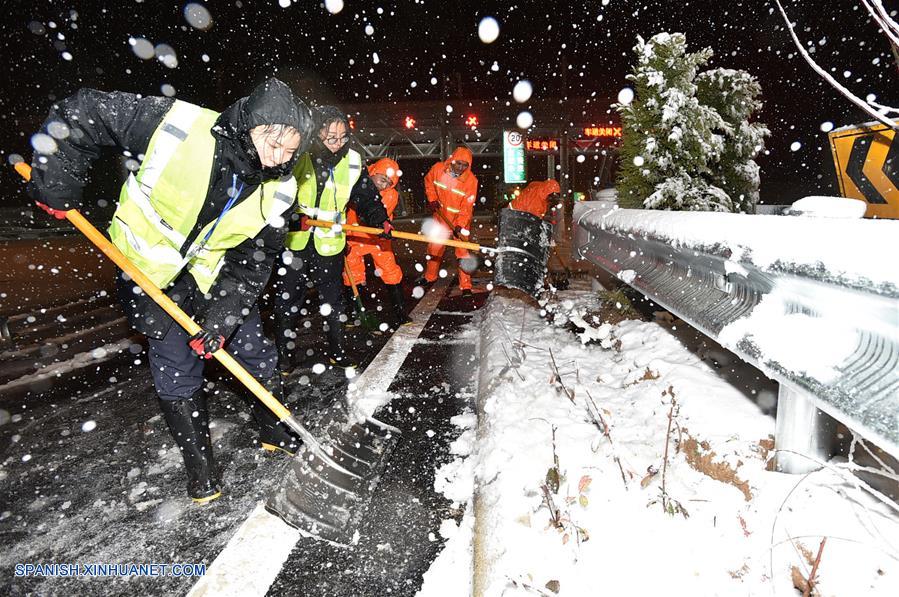 JIANGSU, enero 4, 2018 (Xinhua) -- Empleados de la caseta de peaje Shugang, limpian la nieve en la autopista de Suyang, en Yangzhou, en la provincia de Jiangsu, en el este de China, el 4 de enero de 2018. Muchos lugares alrededor de China vieron una nevada el miércoles. (Xinhua/Zhuang Wenbin)