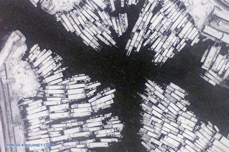JIANGSU, enero 4, 2018 (Xinhua) -- Vista aérea de barcos cubiertos por nieve en el Lago Hongze, en Huai'an, en la provincia de Jiangsu, en el este de China, el 4 de enero de 2018. Muchos lugares alrededor de China vieron una nevada el miércoles. (Xinhua/Wan Zhen)