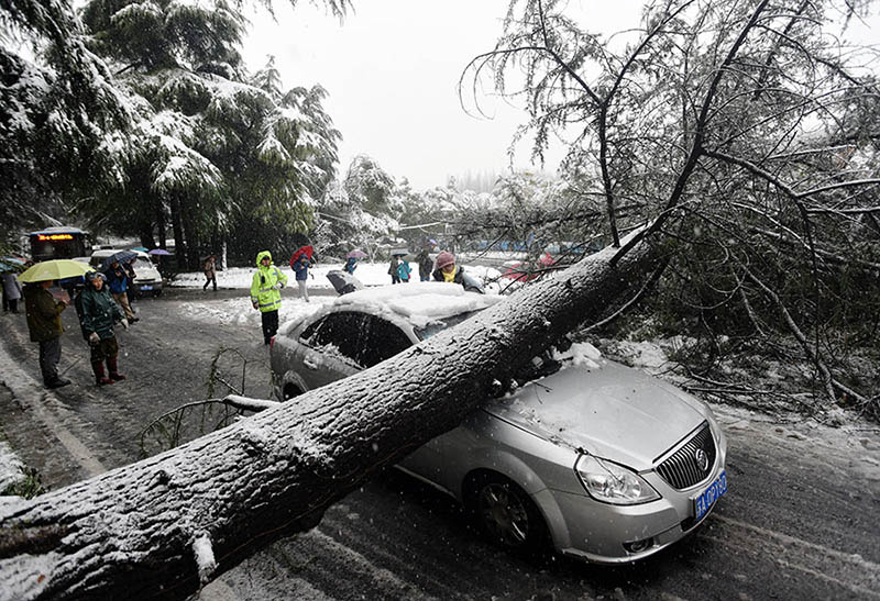 Un coche fue aplastado por un cedro derribado por una fuerte nevada del jueves por la ma?ana en Nanjing, provincia de Jiangsu. Nadie resultó herido. Cui Xiao / For China Daily