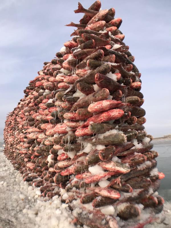 Chagan,05/01/2018(El Pueblo en Línea)- Recientemente, un muro hecho con más de 2.000 peces sobre el lago helado de Chagan, en la provincia de Jilin, en el noreste de China, atrajo mucha atención de los visitantes. El muro, de unos 10 metros de largo y 2 metros de alto, simboliza la alegría de los pescadores, ya que acogen la excelente captura en esta temporada de pesca de invierno.