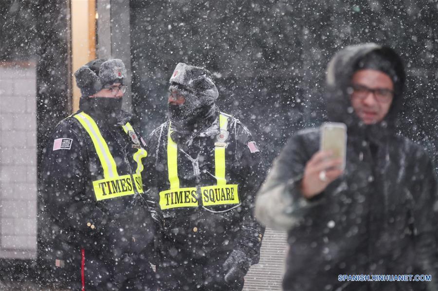Personal de seguridad monta guardia bajo una tormenta de nieve en Times Square en New York, Estados Unidos, el 4 de enero de 2018. (Xinhua/Wang Ying)