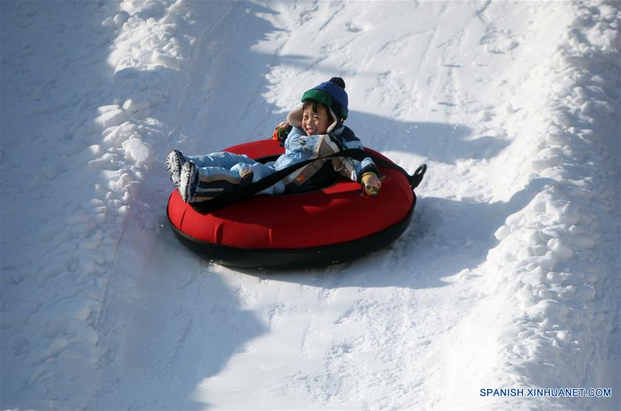 Un ni?o sentado sobre un colchón de aire juega en un festival de hielo y nieve, en Yantai, provincia de Shandong, en el este de China, el 6 de enero de 2018. (Xinhua/Shen Jizhong)