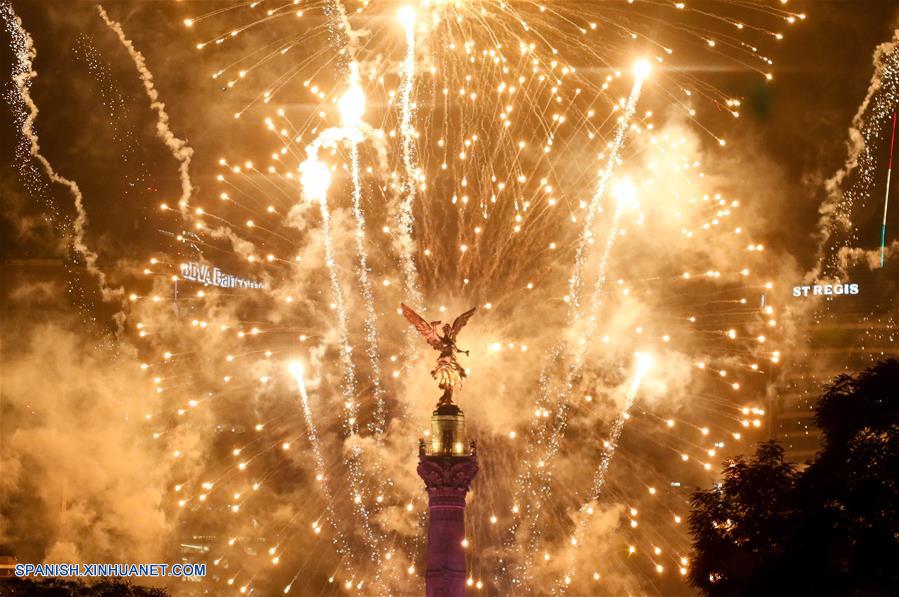 CIUDAD DE MEXICO, enero 8, 2018 (Xinhua) -- Imagen del 1 de enero de 2018, de fuegos artificiales explotando sobre la colmuna del Angel de la Independencia, durante la celebración del A?o Nuevo en la Ciudad de México, capital de México. (Xinhua/Francisco Ca?edo)