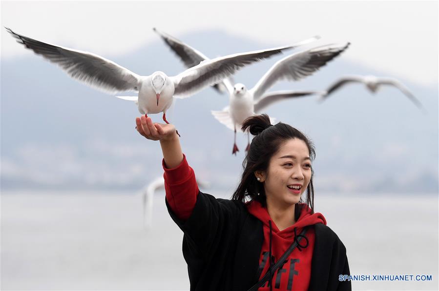 Una joven posa con gaviotas de cuello negro en el Lago Dianchi en Kunming, capital de la provincia de Yunnan, en el suroeste de China, el 10 de enero de 2018. (Xinhua/Lin Yiguang)