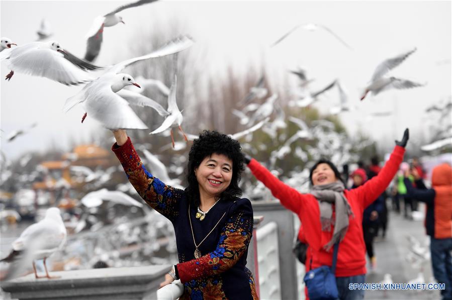 YUNNAN, enero 10, 2018 (Xinhua) -- Visitantes posan con gaviotas de cuello negro en el lago Dianchi en Kunming, capital de la provincia de Yunnan, en el suroeste de China, el 10 de enero de 2018. (Xinhua/Lin Yiguang)