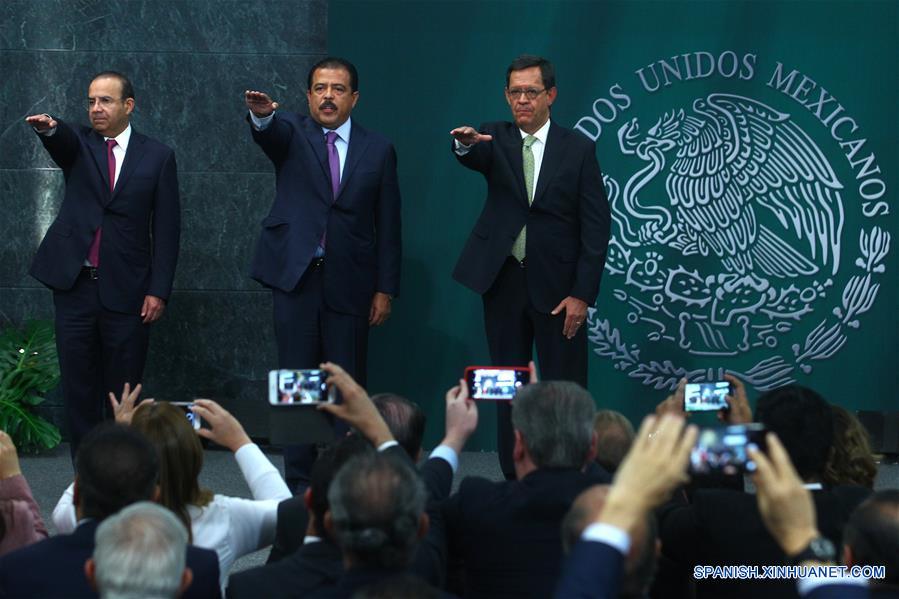 CIUDAD DE MEXICO, enero 10, 2018 (Xinhua) -- Alfonso Navarrete (i), Eviel Pérez (c), y Roberto Campa (d), toman protesta como nuevos secretarios mexicanos de Gobernación, Desarrollo Social, y Trabajo y Previsión Social, respectivamente, durante su ceremonia de juramentación, en la Ciudad de México, capital de México, el 10 de enero de 2018. De acuerdo con información de la prensa local, Enrique Pe?a Nieto juramentó al nuevo titular de la Secretaría de Gobernación (Segob), Alfonso Navarrete, en sustitución de Miguel Angel Osorio Chong, quien buscará un esca?o en el Senado mexicano, y también tomó protesta a Eviel Pérez como nuevo secretario de Desarrollo Social, y a Roberto Campa como nuevo secretario de Trabajo y Previsión Social, en sustitución de Navarrete Prida. (Xinhua/Ricardo Aldayturriaga)