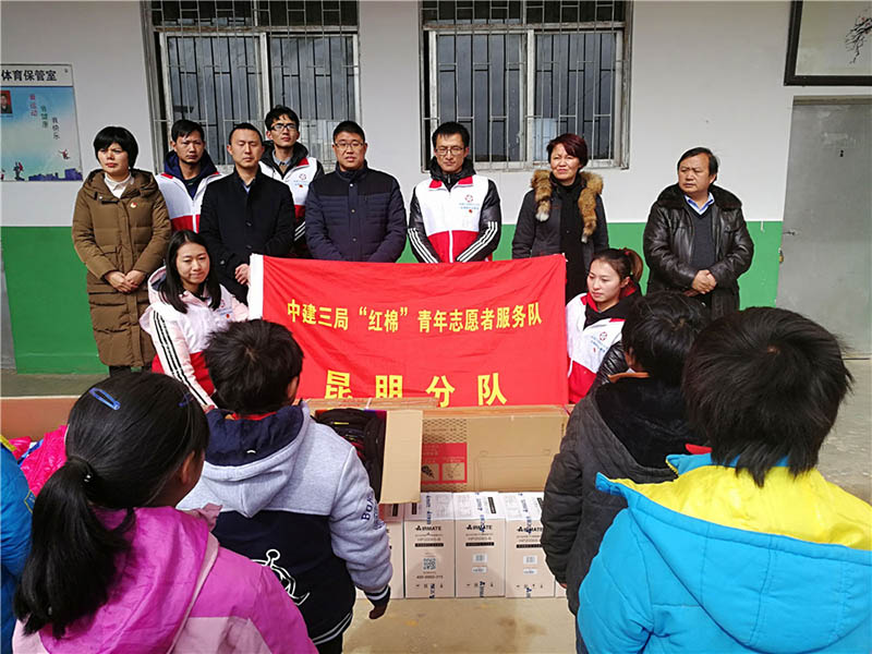 Representantes del gobierno local y los voluntarios entregan el primer lote de subsidios de invierno a la escuela donde estudia Wang Fuman. [Foto: Ye Longfei]