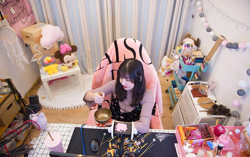 Xiu Weiya, una presentadora ??de transmisión en vivo de ASMR, produce un sonido frente al micrófono y la cámara, en Guangzhou, provincia de Guangdong, el 4 de noviembre de 2017. [Foto / VCG]