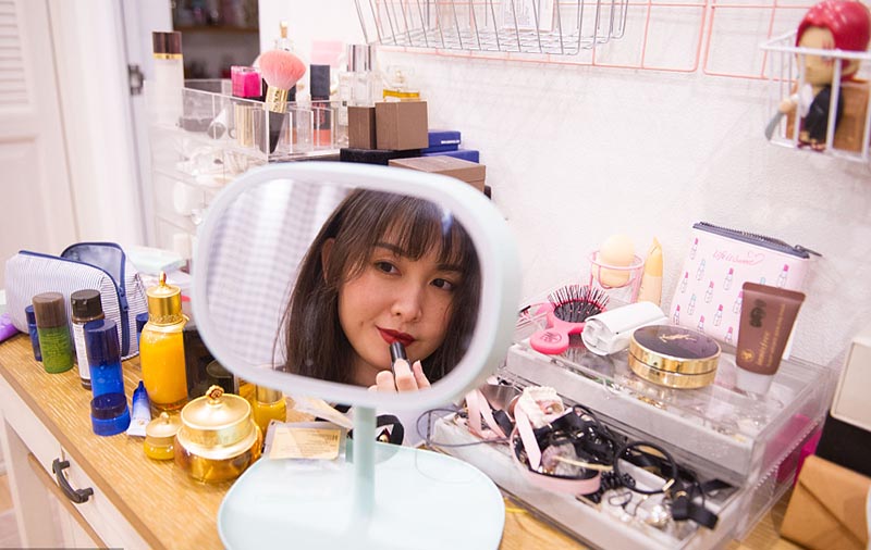 Xiu Weiya, una presentadora ??de transmisión en vivo de ASMR, se maquilla antes de comenzar a transmitir, en Guangzhou, provincia de Guangdong, el 4 de noviembre de 2017. [Foto / VCG]