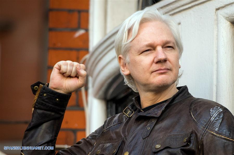 Imagen de archivo del 19 de mayo de 2017 del fundador del portal Wikileaks, el australiano Julian Assange, gesticulando en el balcón de la embajada de Ecuador en Londres, Reino Unido. (Xinhua/Dominic Lipinski/PA Wire/ZUMAPRESS)