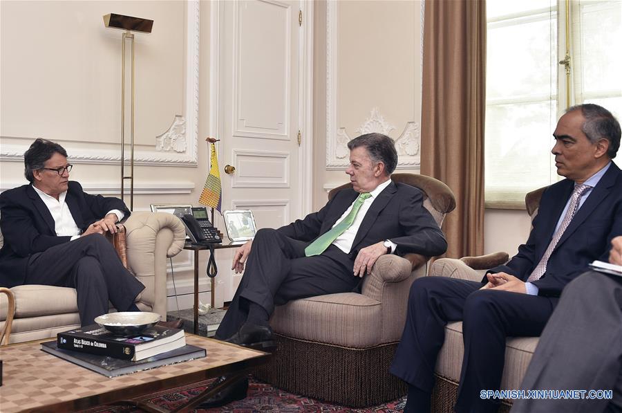 Imagen cedida por la Presidencia de Colombia del presidente colombiano, Juan Manuel Santos (c), reuniéndose con el jefe del equipo negociador del gobierno colombiano en los diálogos de paz con el Ejército de Liberación Nacional (ELN), Gustavo Bell (i), y el Alto Comisionado para la Paz, Rodrigo Rivera (d), en la Casa de Nari?o en Bogotá, capital de Colombia, el 11 de enero de 2018. (Xinhua/César Carrión/Presidencia de Colombia)
