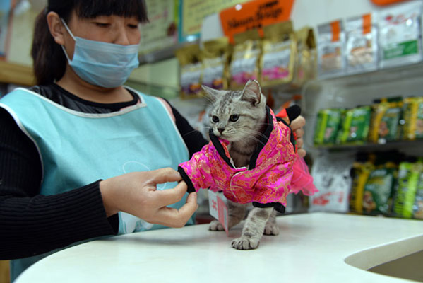 Un empleado viste a un gato con ropa de invierno en Liaocheng, provincia de Shandong. [Foto de Kong Xiaozheng / For China Daily]