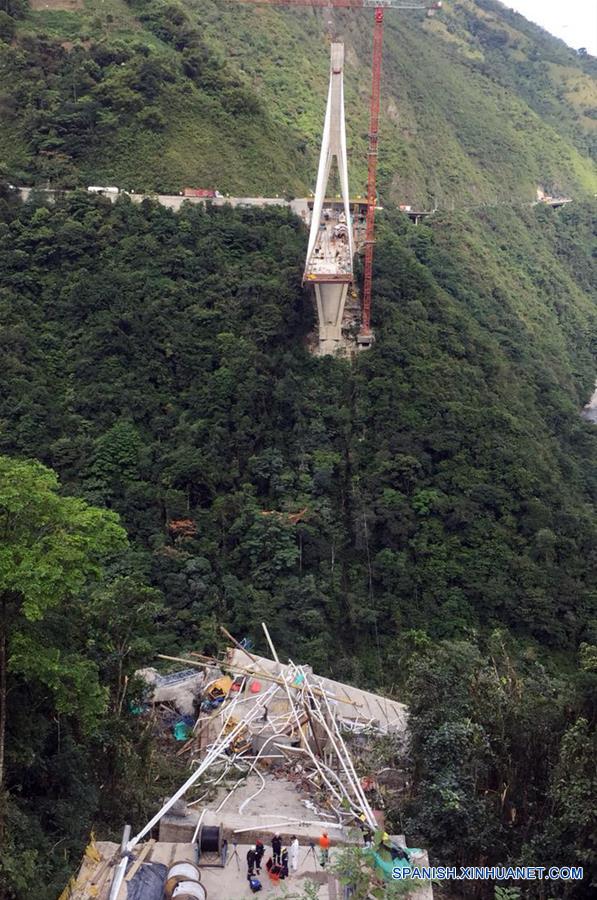 META, enero 15, 2018 (Xinhua) -- Personas laboran en el sitio del desplome de un puente, en el departamente de Meta, Colombia, el 15 de enero de 2018. Al menos 10 muertos y ocho heridos dejó el lunes el desplome de un puente en construcción en la carretera que une las ciudades de Bogotá y Villavicencio. Jorge Díaz, director de la estatal Defensa Civil en el departamento de Meta, afirmó que los trabajadores cayeron de una altura aproximada de 280 metros y en el momento del colapso había sobre la estructura unas 20 personas trabajando. (Xinhua/COLPRENSA)