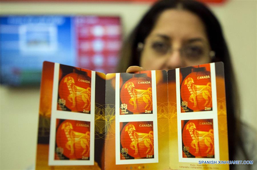 TORONTO, enero 15, 2018 (Xinhua) -- Una integrante de la oficina de correo de Canadá, muestra las estampillas internacionales del a?o del perro en Toronto, Canadá, el 15 de enero de 2018. El correo de Canadá emitió el lunes las estampillas coleccionables del A?o del Perro, en celebración del próximo A?o Lunar Chino del Perro. (Xinhua/Zou Zheng)