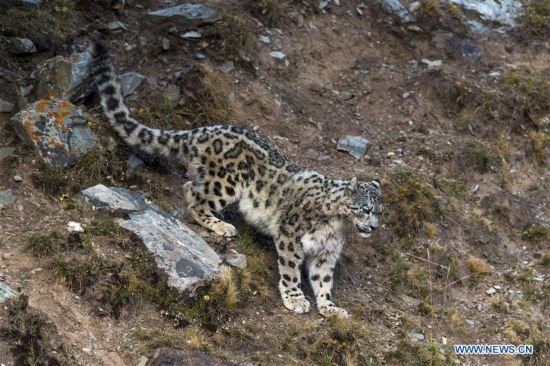 Qinghai,16/01/2018(El Pueblo en Línea)- La foto tomada el 22 de octubre del 2017 muestra un leopardo de las nieves en el Parque Nacional Tres Ríos, en la provincia de Qinghai. China es el hogar seguro de 2.000 a 2.500 ejemplares del protegido leopardo de las nieves. Este felino propio de ambientes fríos y nevados, es una de las especies que se encuentra en mayor peligro de desaparición en el continente asiático junto al tigre y el oso panda. Las poblaciones se distribuyen en Xinjiang, Tíbet, Qinghai, Gansu, Sichuan, Yunnan y Mongolia Interior. La cantidad de leopardos de las nieves como el área total de su hábitat en China representan más de la mitad del total mundial. (Foto: Xinhua)