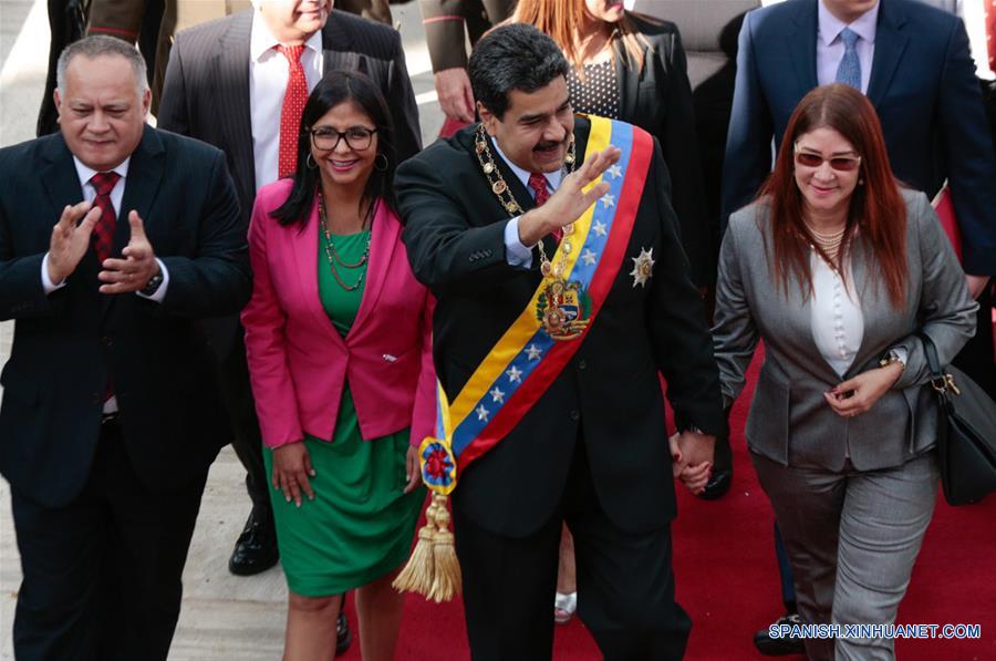 CARACAS, enero 15, 2018 (Xinhua) -- El presidente venezolano, Nicolás Maduro (2-d-frente), acompa?ado por su esposa Cilia Flores (2-i-frente), la presidenta de la Asamblea Nacional Constituyente (ANC) de Venezuela, Delcy Rodríguez (d-frente), y el constituyente y primer vicepresidente del Partido Socialista Unido de Venezuela (PSUV), Diosdado Cabello (i-frente), llega al Palacio Federal Legislativo para rendir su mensaje anual a la nación ante la ANC, en Caracas, Venezuela, el 15 de enero de 2018. De acuerdo con información de la prensa local, Maduro ofreció su mensaje anual a la nación ante la ANC luego de que este órgano plenipotenciario lo citara el 5 de enero por una propuesta presentada por la también constituyente Cilia Flores, que responde al "desacato" en que permanece la Asamblea Nacional (AN) desde 2016. (Xinhua/Boris Vergara)